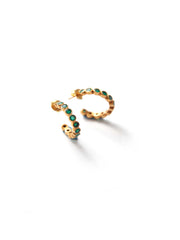Faceted green onyx cyrstals in round shapes are encased in sterling silver (polished in 18K gold polish) to make this hoop shaped earring. Green Onyx is deep emerald green in colour and is highly reflective and translucent. It is a supportive and protective stone. Historically it has been used for its protective qualilites and to impart courage to its wearer. People in India believed that wearing onyx protected them from the evil eye. It is the birthstone for people born in the month of May.